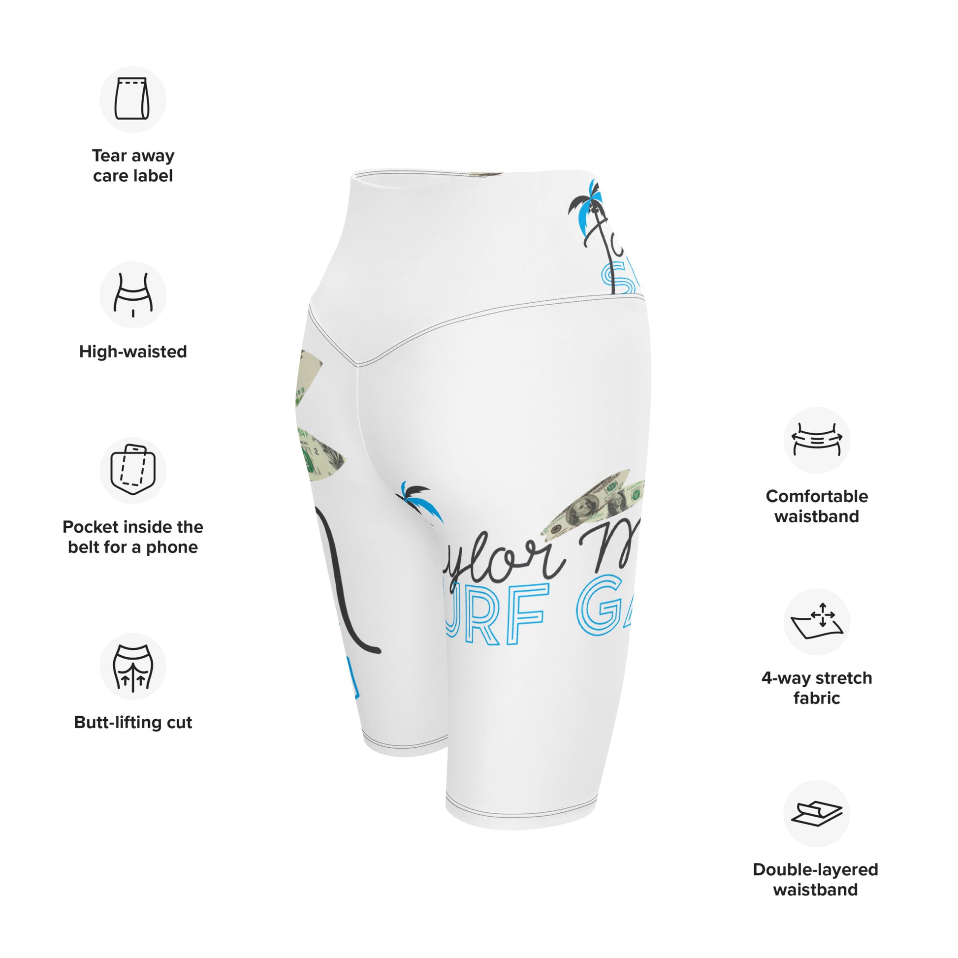 • Double-layered waistband with a pocket in the back for a phone and keys